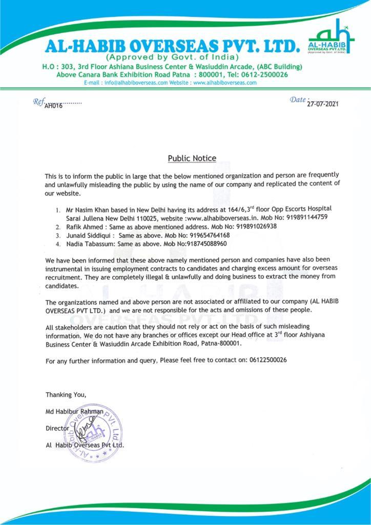 - Mr. Nasim Khan based in New Delhi having its address at 164/6, 3rd floor Opp Escorts Hospital, Sarai Julena, New Delhi 110025, website: www.alhabiboverseas.in. Mob No: 919891144759